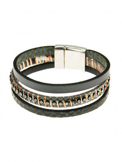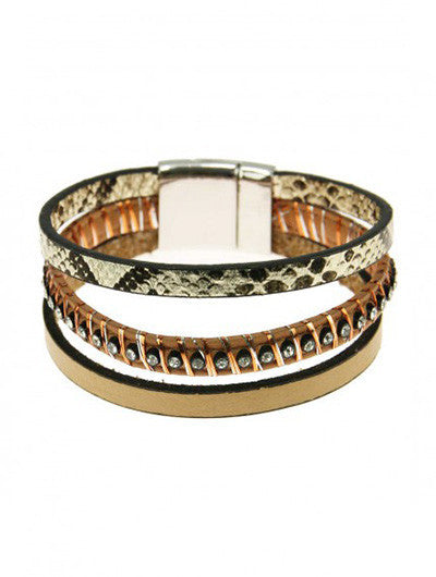 Deze armband mag niet ontbreken om je pols! Drie in één armband van leer en magneet sluiting. Onder andere een leuke snake print en bezet met steentjes.