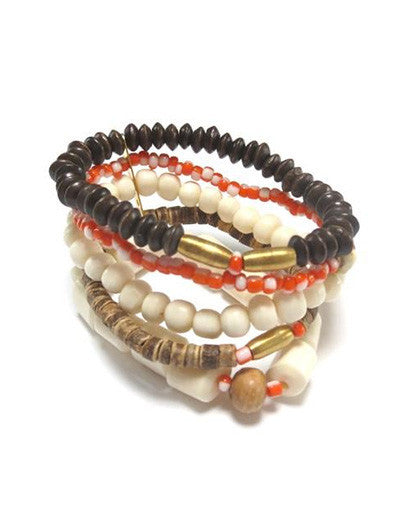 Deze mooie armband in neutrale kleuren bestaat uit 5 armbandjes van verschillende natuurlijke materialen. Met een fris oranje detail!