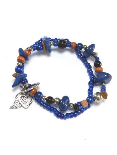 Mooie armband in de kleuren kobaltblauw, bruin, zwart en zilver. Het zijn twee armbandjes die met elkaar verbonden zijn door een ringetje. Afgewerkt met leuke bedeltjes.