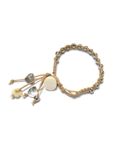 Handgeknoopte armband van waxkoord. De uiteinden zijn versierd met twee hartjes en een wit steentje. De witte platte knoop gebruik je om de armband vast te maken. Sparkling Love is verstelbaar.